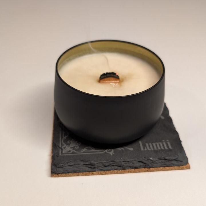 With a thoroughly cooled candle start by trimming the wick. Use a wooden wick trimmer or pinch away the burned portion of the wick. The wick should be between (1/8 - 1/4) of an inch. Shorter wicks will consume less wax and minimize soot.